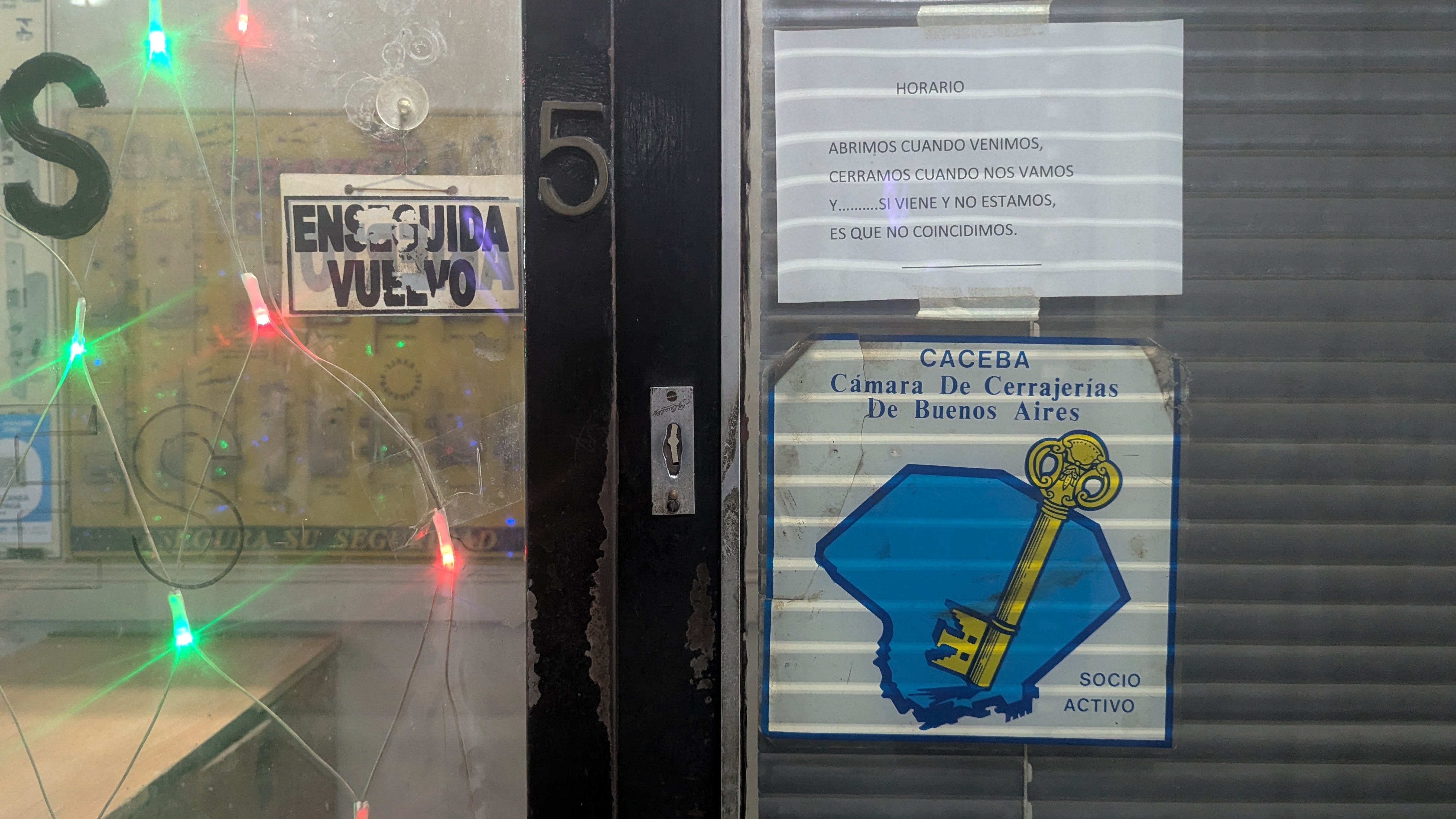 Salí de casa para ir a Los Galgos a una reunión, un camino que hago en 35 minutos caminando. Llevaba una llave para hacerle una copia. Sabía que en algún lugar del camino había una cerrajería pero no me acordaba dónde. Ya en Lavalle, en la cuadra del bar, vi el cartel, en la puerta de una galería. Ese era el lugar, había pasado muchas veces y lo recordaba. Entré hasta el fondo y la encontré cerrada con este cartel.